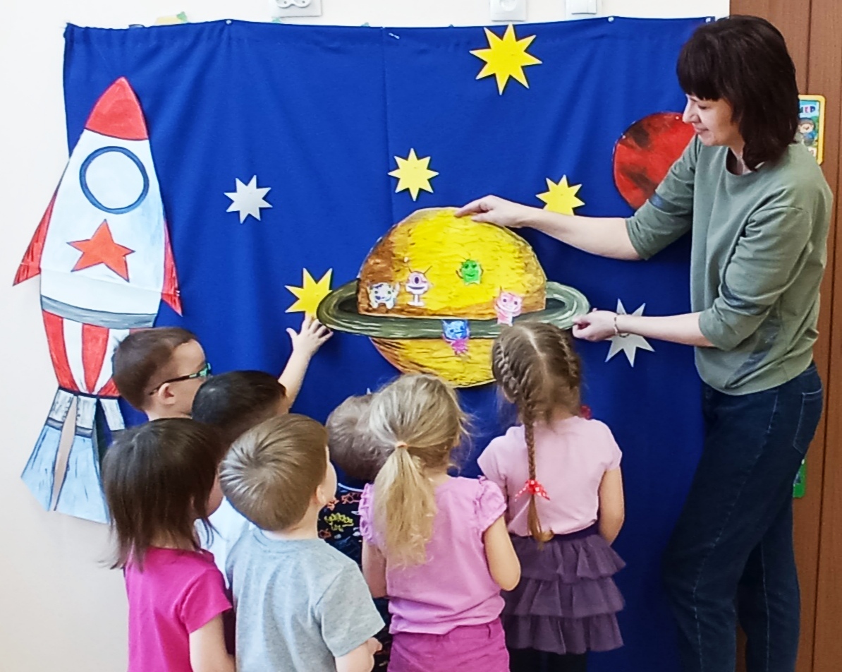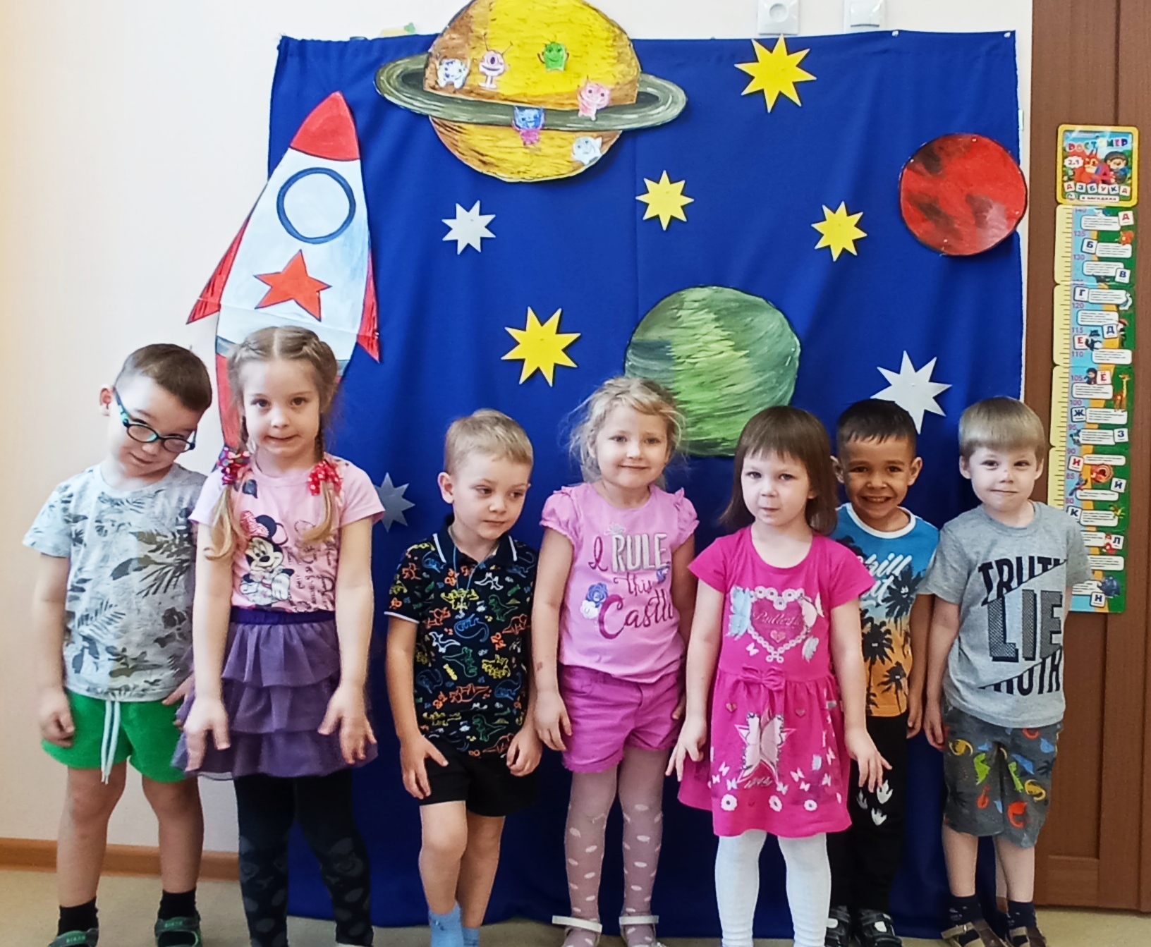 12 апреля 2021 году отмечается 60-летие со дня полета первого человека в космос. И первым космонавтом был Юрий Гагарин, который совершил полет вокруг земли и вернулся благополучно на землю. Так началось время космических открытий и исследований. Что же рассказать детям младшего возраста о космосе!? В младшей группе, на тематической неделе «День космонавтики» были запланированы следующие мероприятия: чтения художественной литературы по данной тематике; рассматривание иллюстраций о космосе; показ презентации «Я и космос»; проведены дидактических и сюжетно-ролевых игр на тему «Космос»; проведено занятие, задачей которой являлось, познакомить детей с космосом, дать представление о планетах. За эту неделю ребята, с удовольствием, погрузились в космические приключения и узнали очень много нового и интересного.