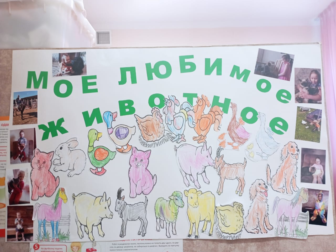 Занятию предшествовала работа с родителями. Родители представили фото детей с домашними животными. На занятии ребята рассказали о своих питомцах, а в заключении было предложено выбрать любое животное и раскрасить его цветными карандашами. По итогу составлен коллаж и расположен в родительском уголке.