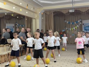 Между эстафетами дети вместе с папами играли в весёлую игру «Паповоз» и показали небольшое музыкально-спортивное представление с мячами «Футбол».