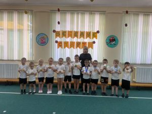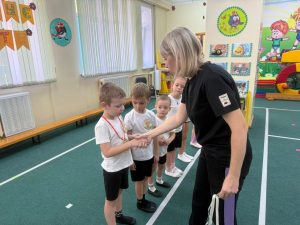 После разминки ребята разделились на команды, выбрали капитанов. Во время эстафет поддерживали друг друга. Старались первыми принести эстафетную палочку, поменять кубик и пройти полосу препятствий. Больше всего в старшей группе понравилось перетягивать канат, а в подготовительной – эстафета «Веселые прыжки с мячом». Во время небольших пауз между испытаниями участники показали знание видов спорта. В конце мероприятия команды были награждены медалями.