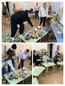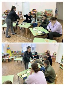 Также родители примерили на себя роль детей. Воспитатель с помощью «волшебной палочки» переместил детей-родителей в страну игр, где в музыкально-игровой форме они сделали разминку вместе с капитаном Крабом, поиграли в пальчиковые игры, рисовали отгадки на разносах с манкой, находили и прятали игрушку в емкостях с горохом.